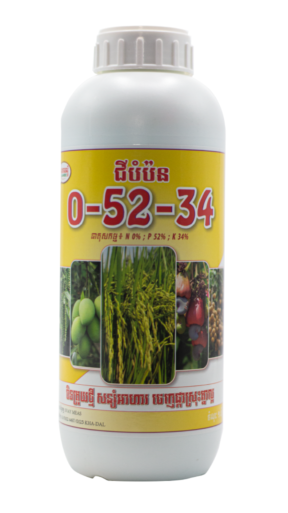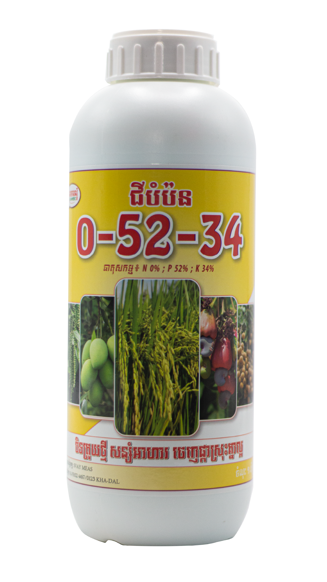 ជីទឹក 0-52-34 ជាប្រភេទជីបំប៉ន និងរលាយក្នុងទឹកទាំងស្រុង អាចប្រើប្រាស់ស្រោចគល់ បាញ់លើស្លឹក ប្រើតាមបំពង់តំណក់ទឹក។ ជីទឹក 0-52-34 ជាភ្នាក់ងារផ្តល់សារធាតុចាំបាច់ដូចជាផូស្វ័រ និងប៉ូតាស្យូម ដើម្បីឱ្យរុក្ខជាតិមានសុខភាពល្អ ចេញត្រួយ និងចេញផ្កាស្រុះគ្នា ដែលនាំឱ្យដំណាំមានគុណភាពខ្ពស់។ ជីទឹក 0-52-34 មានសារធាតុផូស្វាតពិសេសសម្រាប់ដំណាំដែលឫសកំពុងត្រូវការលូតលាស់ខ្លាំង។
